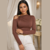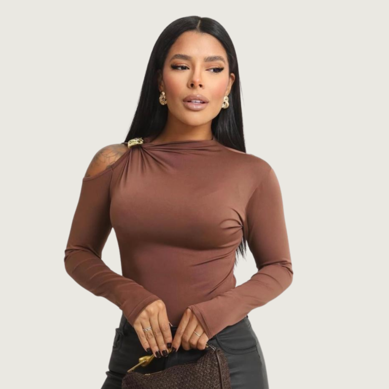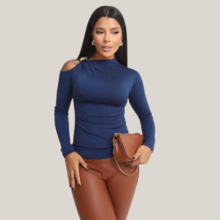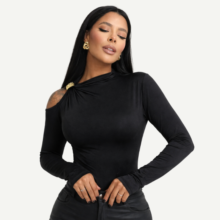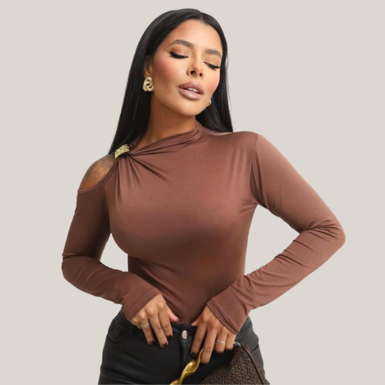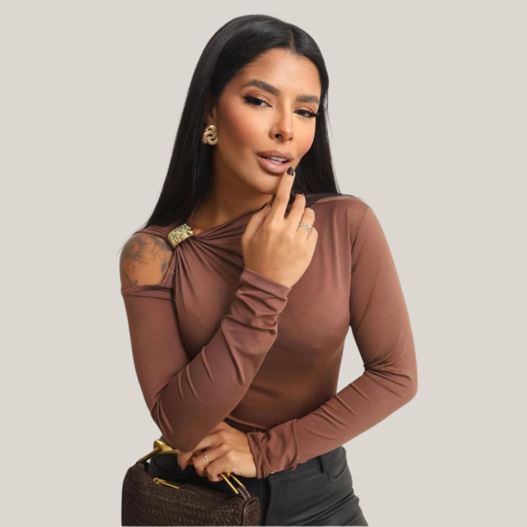 Blusa feminina confeccionada em suplex, tecido com elasticidade, confortável e de ótimo caimento no corpo. Possui modelagem ajustada, mangas longas e detalhe de ombro vazado com acessório decorativo, trazendo um visual moderno e elegante.