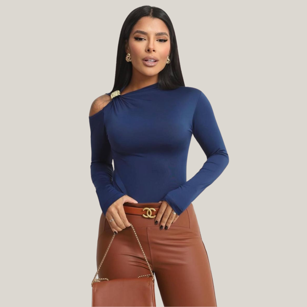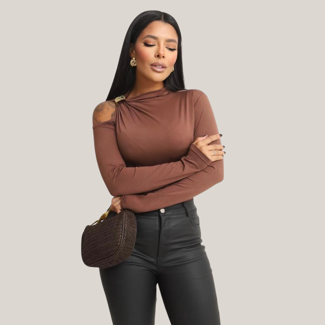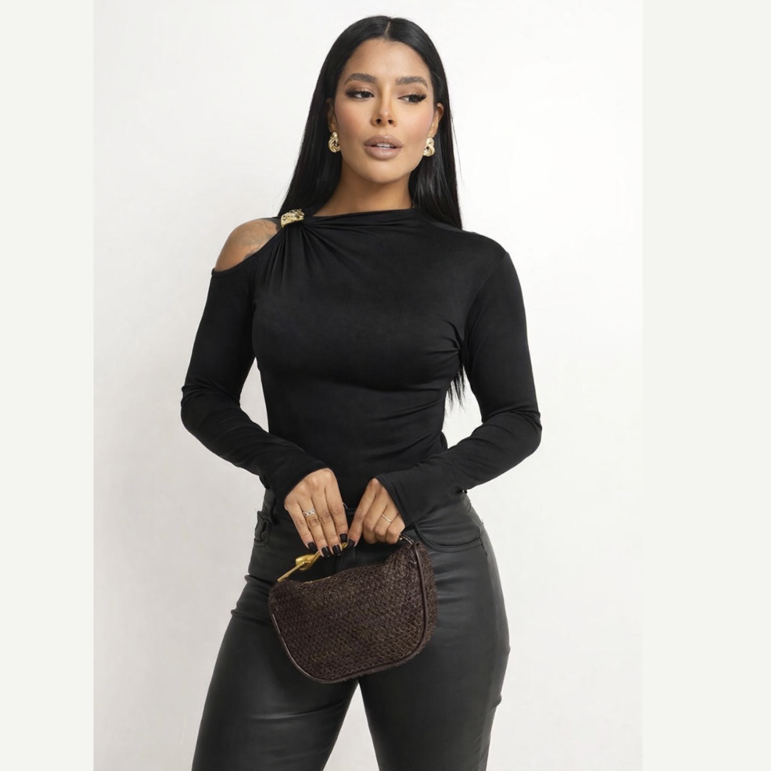 Blusa feminina confeccionada em suplex, tecido com elasticidade, confortável e de ótimo caimento no corpo. Possui modelagem ajustada, mangas longas e detalhe de ombro vazado com acessório decorativo, trazendo um visual moderno e elegante.