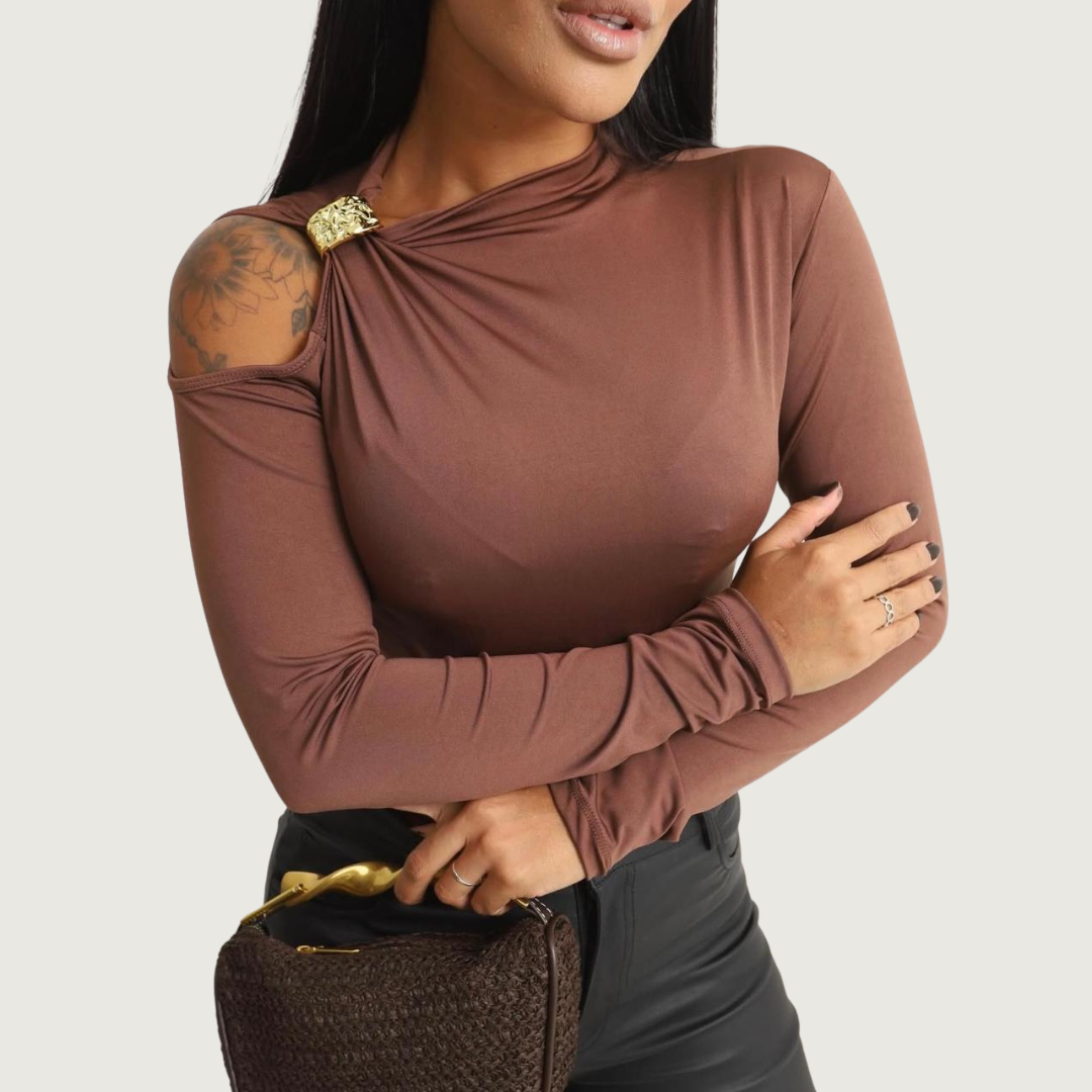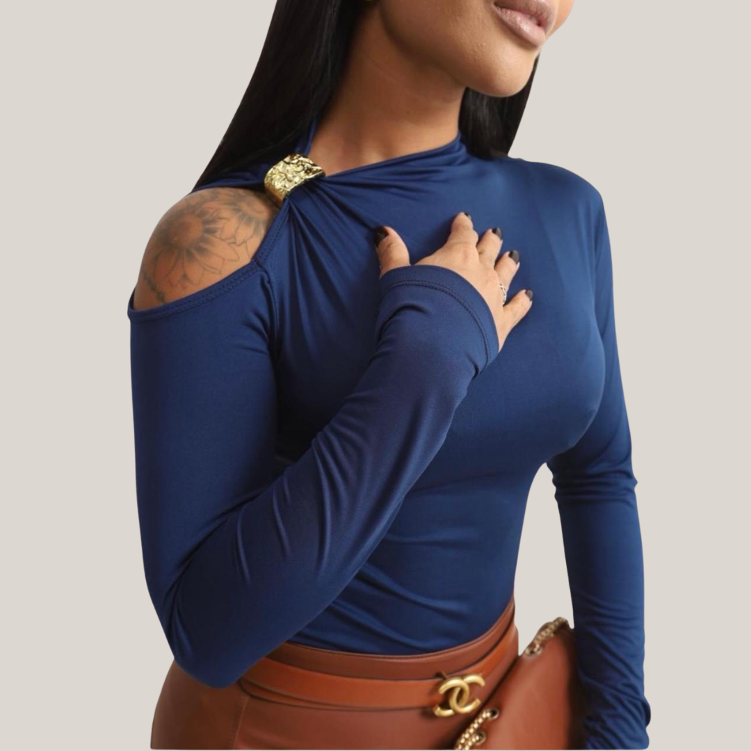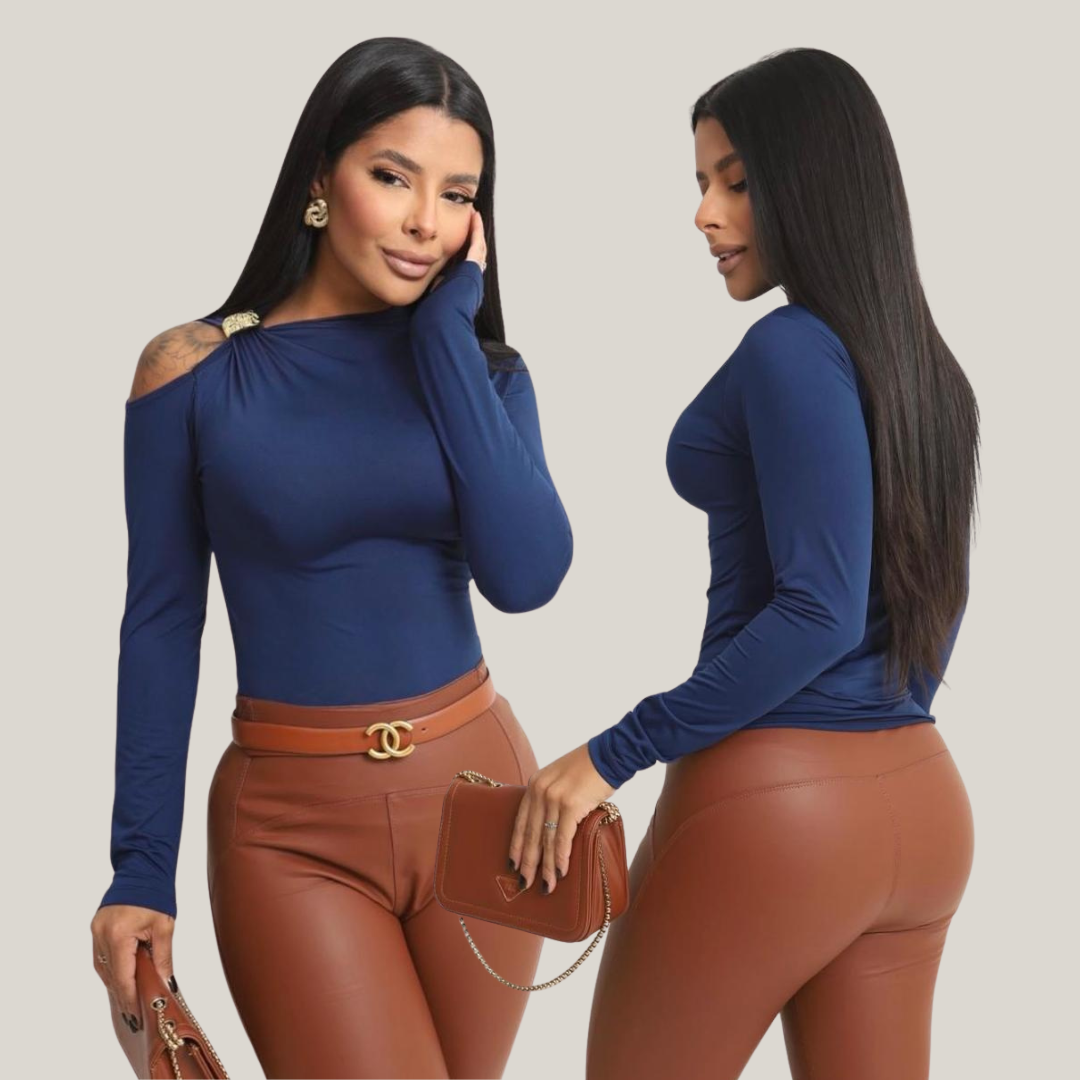 Blusa feminina confeccionada em suplex, tecido com elasticidade, confortável e de ótimo caimento no corpo. Possui modelagem ajustada, mangas longas e detalhe de ombro vazado com acessório decorativo, trazendo um visual moderno e elegante.