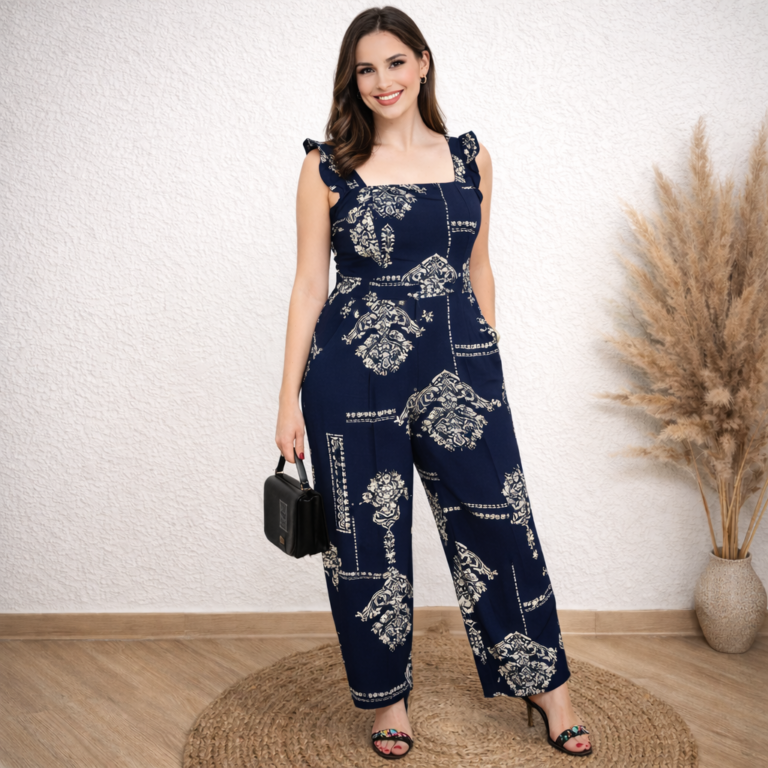 O Macacão Estampado Beatriz tem elástico nas costas e apresenta detalhes como babados nas alças para uma leveza e elegância. A calça ampla nas pernas, com corte estilo meia pantalona, proporcionando uma silhueta elegante e modela ao corpo.